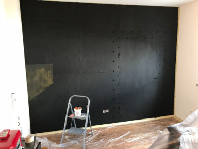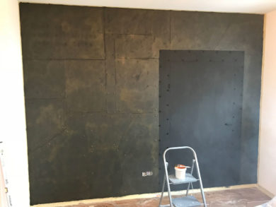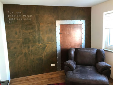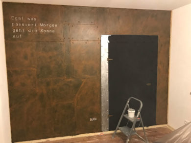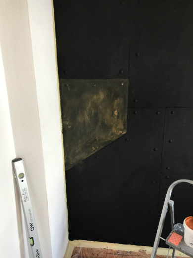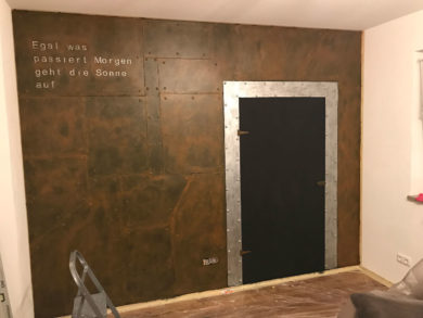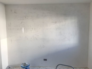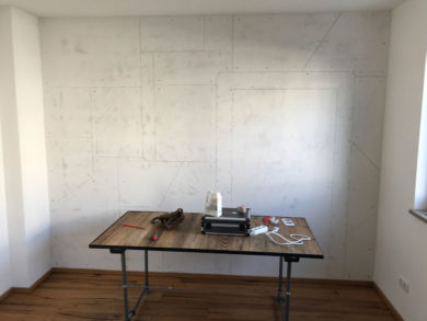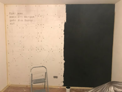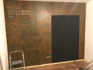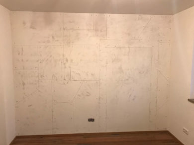 - Die Wand habe ich vorab mit Spachtelmasse geglättet, doch es ist schöner, wenn die Wand nicht perfekt geglättet ist.